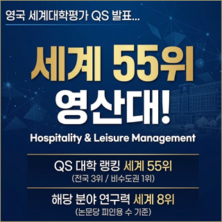 재학생 대학생활에 필요한 정보들을 제공합니다. 예비신입생 예비신입생에게 와이즈유를 소개합니다. 교직원&동문 와이즈유의 다양한 소식들을 전달합니다. WHO?자랑스런 와이즈유 OPEN CAMPUS오픈캠퍼스 YES21교직원 그룹웨어 WISEU TIMES와이즈유 타임즈 재학생 Mypage 학사정보시스템 YCMP(취업·비교과) 학사일정 등록금납부 수업 학적 학사서식 증명서발급 졸업인증제 e-class 교수학습개발원 도서관 스쿨버스 학생생활관 (기숙사) 교내식당 주간메뉴 국제교류 학생활동 풋살경기장 잔디운동장 창의설계실 생활정보 캠퍼스맵 양성평등상담실 장학 학습지원 메타버스 예비신입생 입학안내 대학소개 학과소개 언론홍보 내인생의스승 자랑스런 와이즈유인 오시는길 학생생활관 (기숙사) e-class 지원자조회 수강신청 교과목보기 메타버스 교직원&동문 YES21 교직원정보시스템 공지사항 학사일정 e-class 도서관 교수학습개발원 대학이미지(UI) 전화번호검색 캠퍼스맵(강의실검색) 증명서발급 메타버스 닫기 1 / 정지 재생 지금 와이즈유? 보도자료 만화애니메이션학과, AI 콘텐츠 창작 실습 12시간 몰입 특강 2026-04-09 보도자료 노인복지상담학과, ‘벚꽃 졸업 사진’ 진풍경 2026-04-08 보도자료 항공관광학과 신예향 학생, ‘한국산업인력공단 이사장상’ 수상 2026-04-07 보도자료 미래융합대학, ‘학생 자치‧지역 상생’ 두 마당 펼쳤다 2026-04-06 보도자료 캠퍼스에서 만나는 실크로드… 우즈벡 문화체험 행사 2026-04-03 보도자료 웹툰학과 “벚꽃 아래 스케치, 강의실 밖이 곧 교실” 2026-04-03 보도자료 시니어모델학과, 진해군항제 350만 상춘객 매료 2026-04-02 보도자료 관광문화예술대학, QS대학랭킹 ‘세계 55위’ 2026-03-26 이달의 와이즈유 04.06 1학기 중간 강의평가 기간 04.06 수업일수 1/3선(자퇴자 등록금 5/6 환불 마감일) -일반휴학자 등록금 대치 마감일 04.07 1학기 중간고사 시간표 공고 04.13 하계 계절학기 개설희망교과목 신청기간 04.21 1학기 중간고사 기간 05.01 수업일수 60일(자퇴자 및 일반휴학자 등록금 2/3 환불 마감일) 05.11 1학기 전공배정 및 다전공·전과 신청기간 05.11 수업일수 2/3선-군입대휴학자 등록금 대치 마감일 정지 재생 학사일정 더보기 와이즈유 공지사항 와이즈유 새소식 전체 전체 더보기 학사 학사 더보기 장학 장학 더보기 등록 등록 더보기 취업 취업 더보기 일반 일반 더보기 사회봉사 사회봉사 더보기 바로가기 학사정보시스템 교내식당 스쿨버스 YCMP e-class 증명서발급 수업 학사Q/A 도서관 다양한 소식을 SNS을 통해 알립니다. 영산대학교 페이스북 바로가기 영산대학교 유튜브 바로가기 영산대학교 카카오채널 바로가기 영산대학교 블로그 바로가기 영산대학교 인스타그램 바로가기 영산대 “영심비 와이즈유 페스티벌” 와이즈유 영산대학교 K-MOVE 2개 운영 사업 선정 와이즈유 영산대학교 조리예술학과 김수현 학생, 산업인력공단 이사장상 수상 와이즈유 영산대학교 조리예술학과 김수현 학생, 산업인력공단 이사장상 수상 정지 재생 MICE특성화 해운대캠퍼스Haeundae Campus 관광문화예술대학 호텔관광학과 항공관광학과 관광컨벤션학과 레저스포츠관광학과 조리예술학부 K-Food조리전공 동양조리전공 서양조리전공 Bakery&Beverage전공 글로벌조리전공 미용예술학과 디자인학부 패션디자인전공 인테리어·도예디자인전공 연기공연미디어학부 연기공연예술전공 방송사진미디어전공 K-Pop전공 웹툰학과 게임VR학과 만화애니메이션학과 AI그래픽학과 시니어모델학과 웰니스보건대학 물류경영학과 글로벌학부 한ㆍ베트남통역전공 K-비즈니스전공 비즈니스법전공 미래융합대학 부동산학과 사회복지학과 헬스케어학과 아동·가족상담학과 미용건강관리학과 웰빙조리창업학과 실버재활학과 웰니스특성화 양산캠퍼스Yangsan Campus 웰니스보건대학 간호학과 물리치료학과 치위생학과 태권도학과 동양무예학과 경찰행정학과 융합전공학부 동양상담복지학과 한국어문화교육학과 기계ㆍ자동차공학과 수소시스템공학과 전기전자공학과 건축공학과 컴퓨터공학과 드론공간정보공학과 미래융합대학 인문문화융합학과 노인복지상담학과 성심교양대학 자기설계전공학부